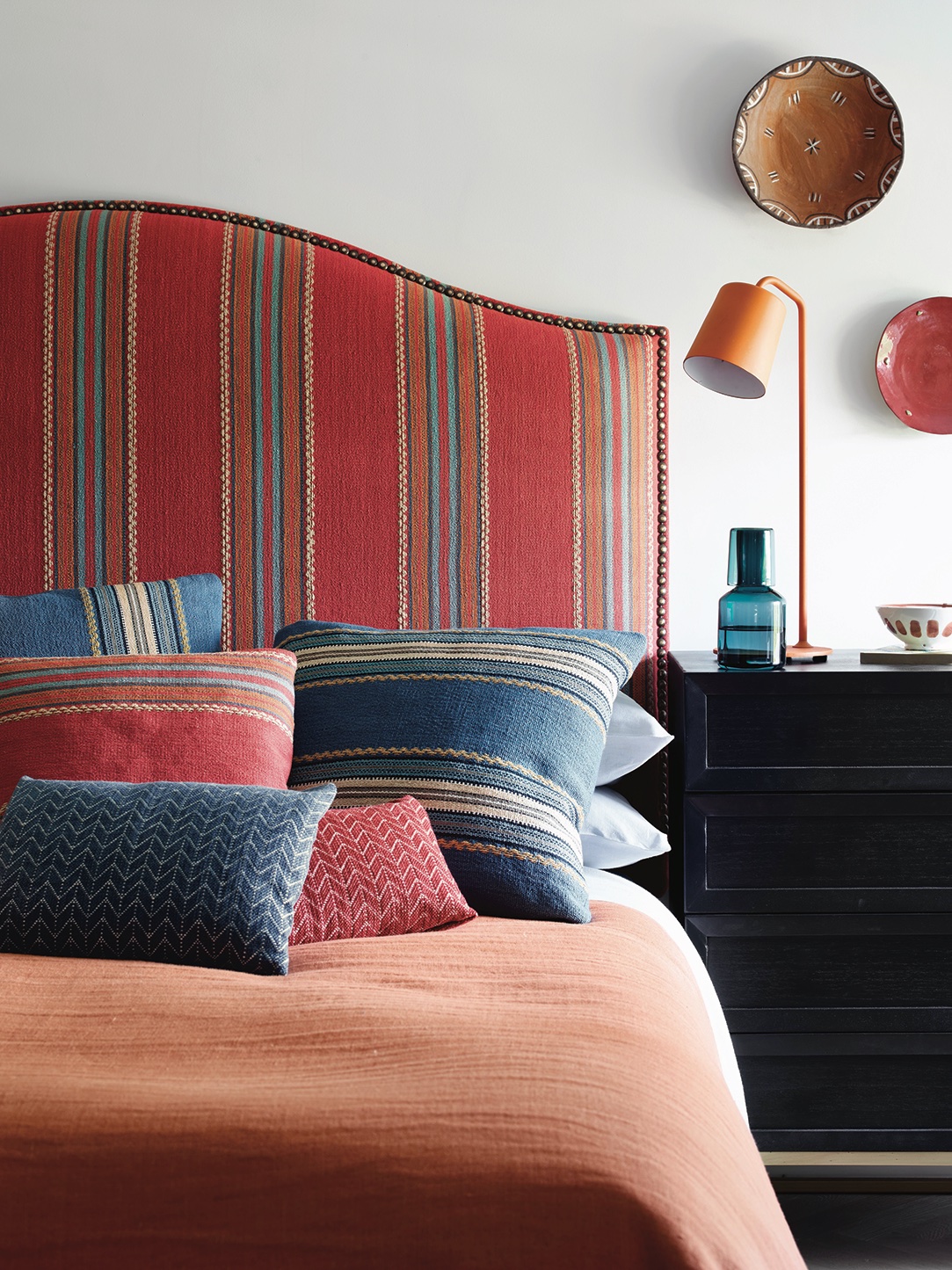 Obicie zagłówka i poduszki z kolekcji Indus Stripe, janechurchill.com