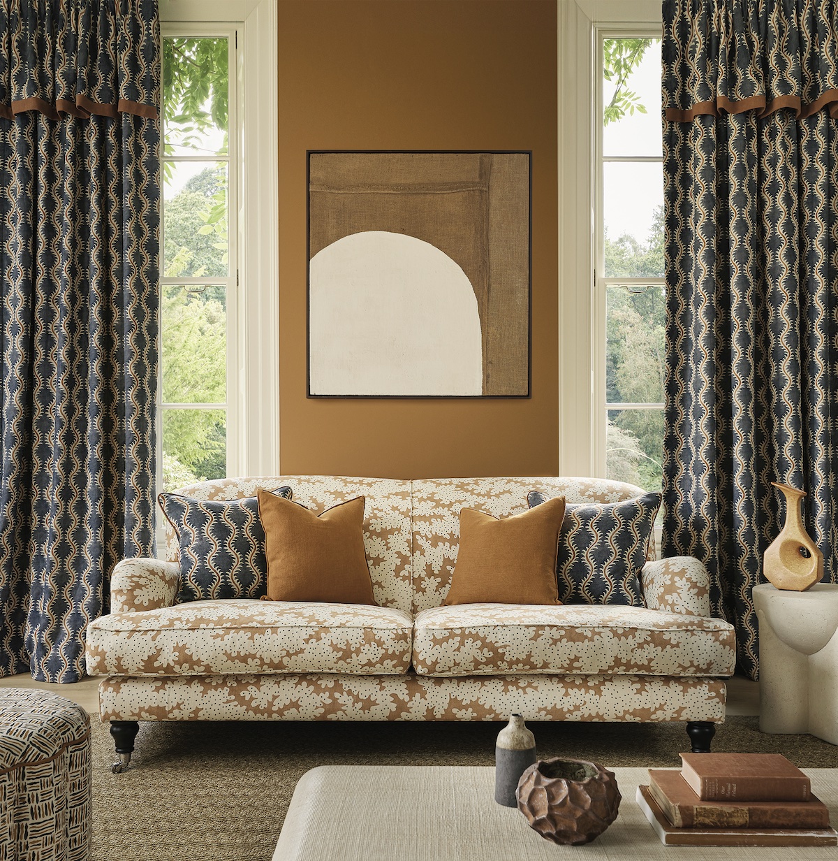 Dominujący wzór jak bohater wnętrza – Helter Skelter (na poduszkach i zasłonach), wzór inspirowany papierem z XVII w. używanym jako wyklejka do książek; na sofie Big Top, nadruk koralowca na lnianej tkaninie, linwoodfabric.com