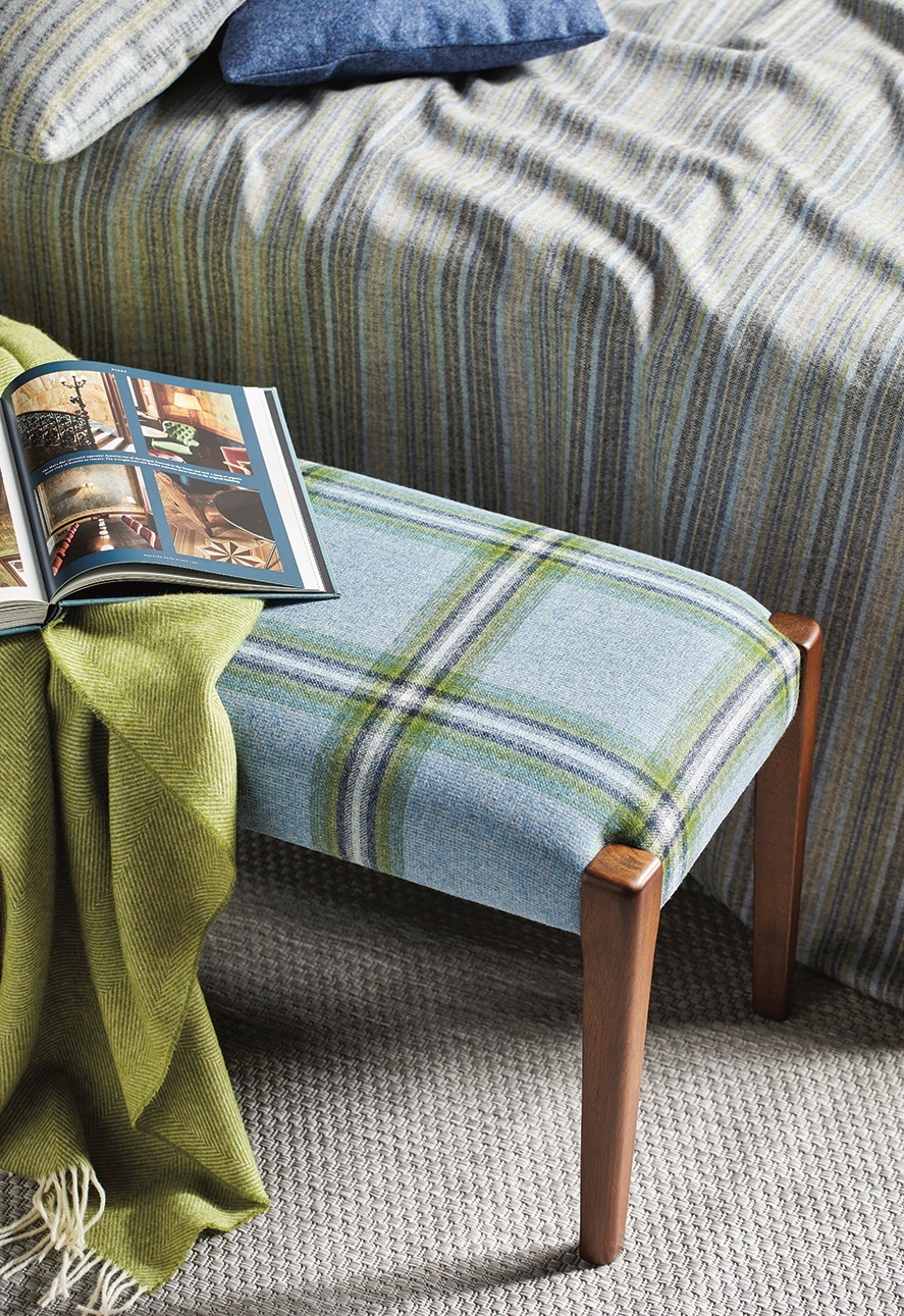 Większy i mniejszy wzór pasów dobrze się uzupełniają. Wełenka New Orleans (na stołku), Tobago i Earth – Pacific (na poduszkach), Santa Cruz (na łóżku), moons.co.uk