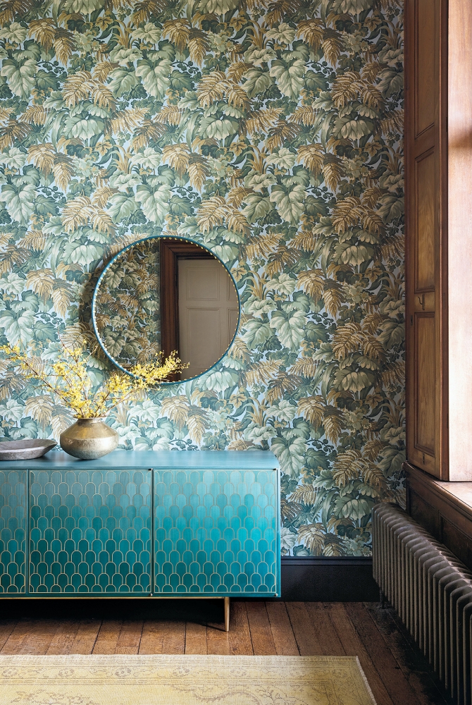 Spokojny w kolorze mebel to dobre towarzystwo dla wzorzystej ściany. Tapeta Martyn Lawrence Bullard od Cole & Son, impresje.pl