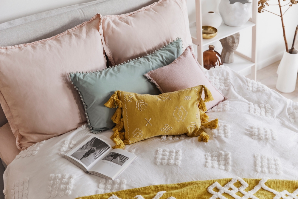 Jak ocieplić sypialnię? Przydadzą się wełniane poduszki i ciepłe pledy. Aranżacja marki Westwingnow.pl