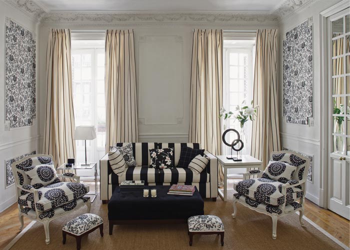 • Graficzne wzory nadają klasycznemu salonikowi oryginalny wyraz. Bawełniane zasłony uszyte są z Tribeca Negro (213