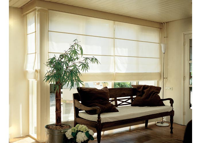Nietypowy układ okna wymagał pomysłowych rozwiązań. Idealnie sprawdzily się tytaj rzymskie rolety. Muślinowa tkanina nie ogranicza całkowicie widoku na taras i ogród. DECORATUM