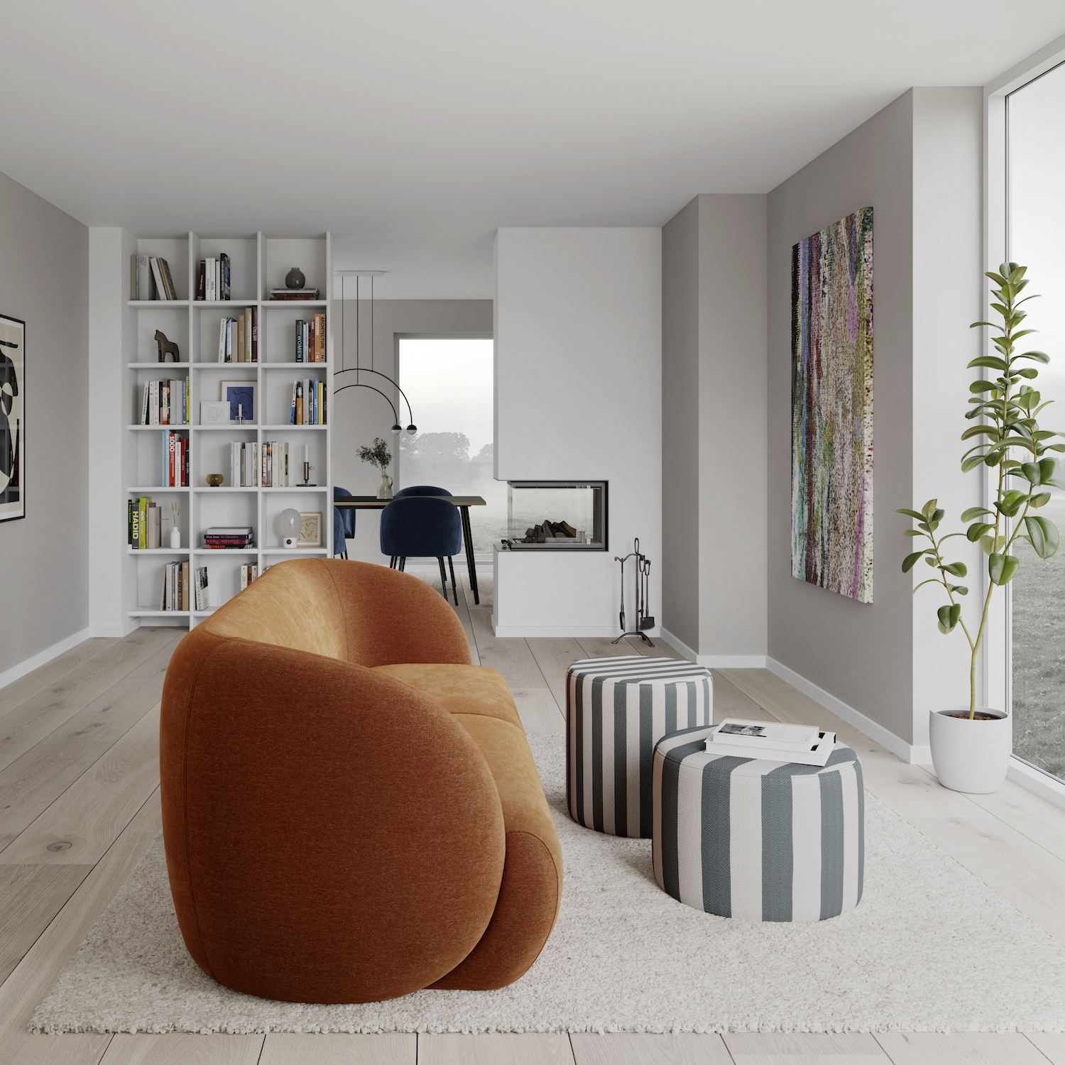 Sofa w połyskującej rudej tapicerce dodaje wyrazistości stonowanej strefie dziennej, sofacompany.com