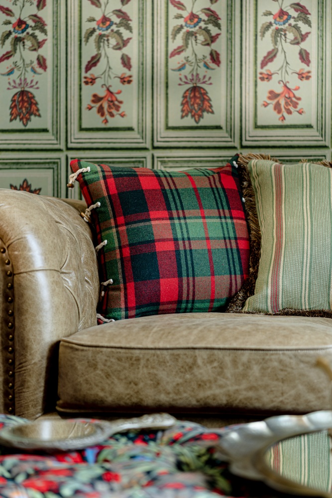 Przytulna i kolorowa poduszka TYROLEAN PLAID wykonana z wełny, aranżacja marki Mindthegap, mindtheg.com