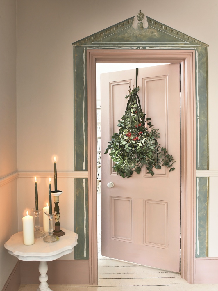 ARANŻACJA MARKI ANNIE SLOAN, NA ŚCIANACH FARBY Wall Paint w kolorze Pompadour, Satin Paint w kolorze Pointe Silk, CHALK PAINT™ w zmieszanych odcieniach Duck Egg, Old White i Grey, ANNIESLOAN.COM/PL