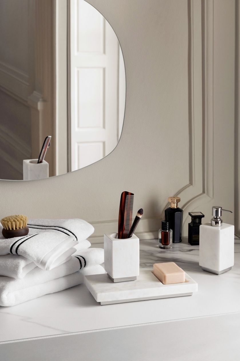 Do klasycznej łazienki pasują marmurowe dodatki: dozownik na mydło, kubek na szczoteczki oraz mydelniczka jak minitaca, H&M Home, hm.com/pl