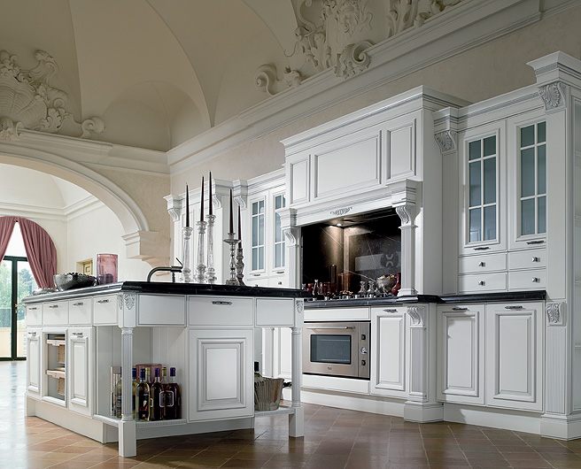 • Rzeźbione gzymsy i pilastry w klasycznej kuchni Dolcevita firmy Stosa, podłoga marmurowa, Studio Italia