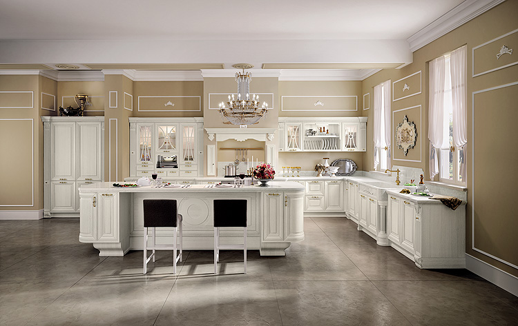 • Rzeźbione gzymsy i pilastry w klasycznej kuchni Dolcevita firmy Stosa, podłoga marmurowa, Studio Italia