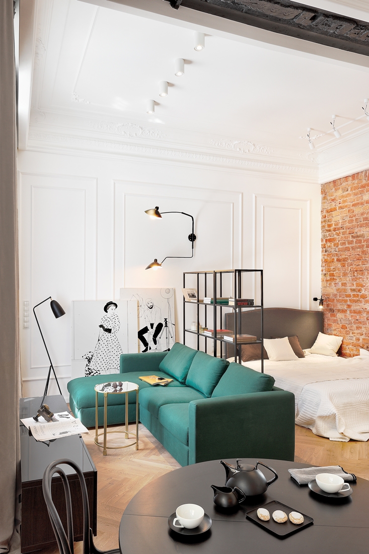 Biel, szmaragd i czerwona cegła w stylowej warszawskiej kawalerce