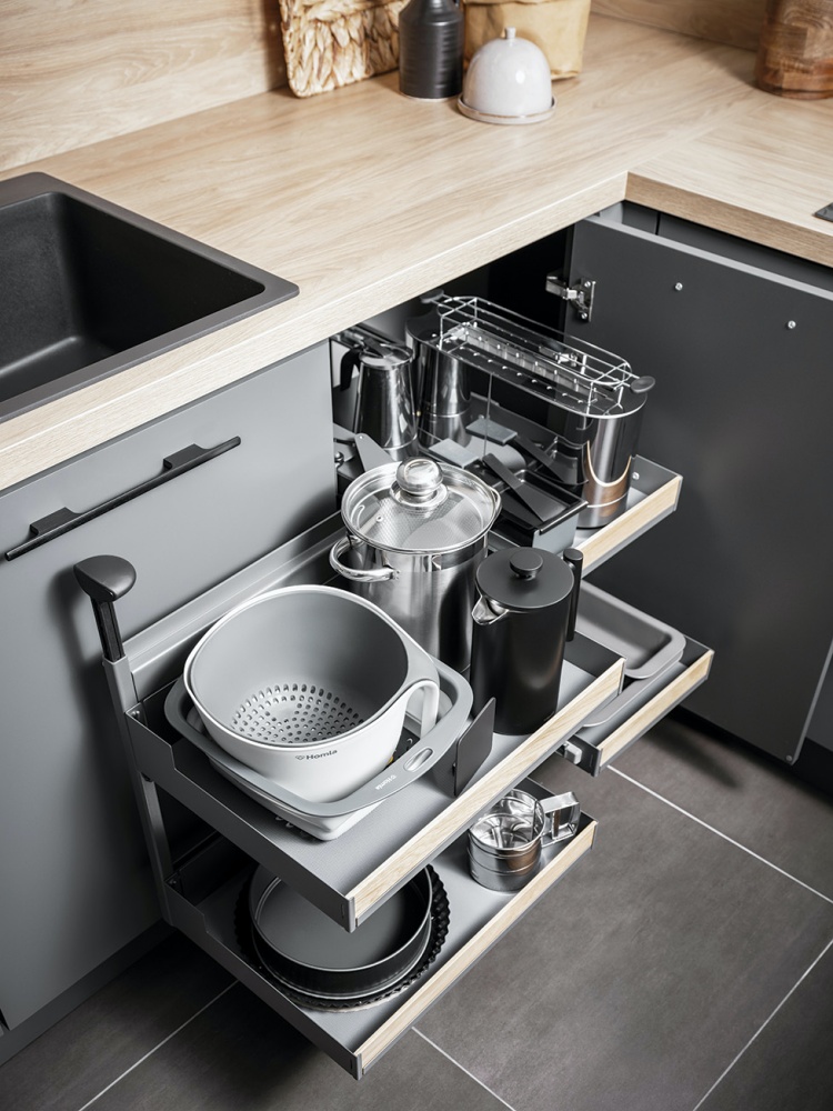 Narożna szafka jest głęboka i bardzo pakowna. Ale jak wygodnie siegnąć do najdalej ukrytych sprzętów? Magic Corner to system, który umożliwia wyciągnięcie całej zawartości szafki na zewnątrz. Pociągnij uchwyt