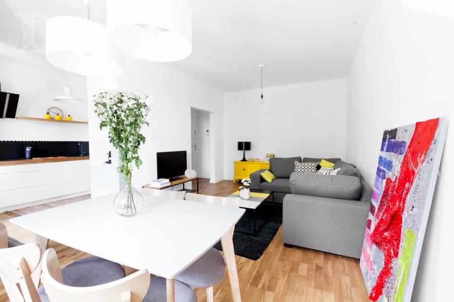 Salon od kuchni oddziela ściana, po obu stronach której są bezdrzwiowe przejścia. Zdjęcie i projekt: Decoroom Architekci & Projektanci Wnętrz