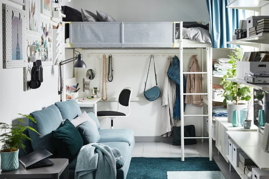Jak urządzić malutki salon w bloku? Pod piętrowym łóżkiem możesz zaaranżować mały kącik do pracy, Ikea.com