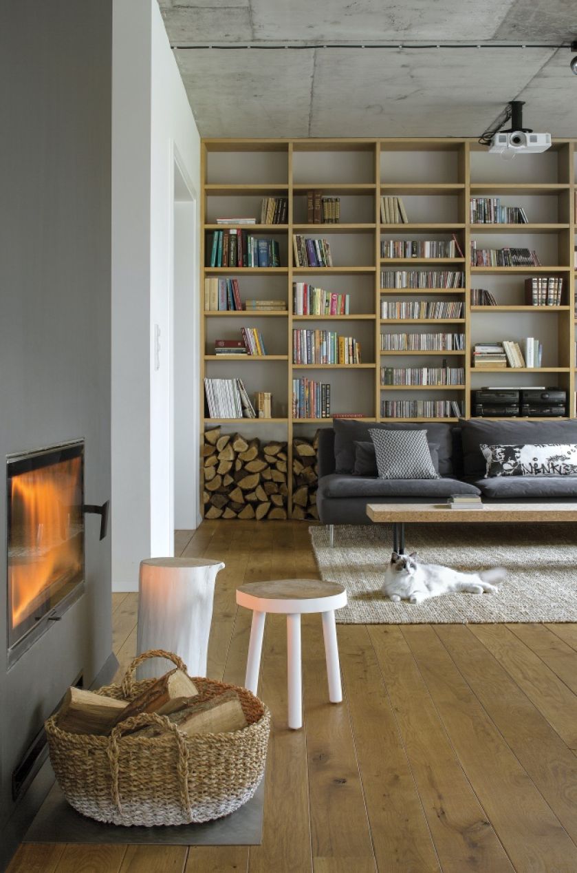 • Kominek w nowoczesnej aranżacji. Drewno opałowe jest tu elementem dekoracyjnym.