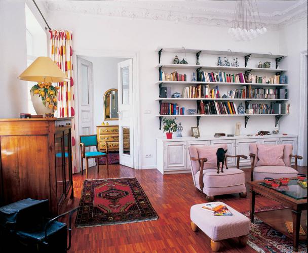 W salonie znajdziemy półki, a na nich książki i zdobione naczynia.