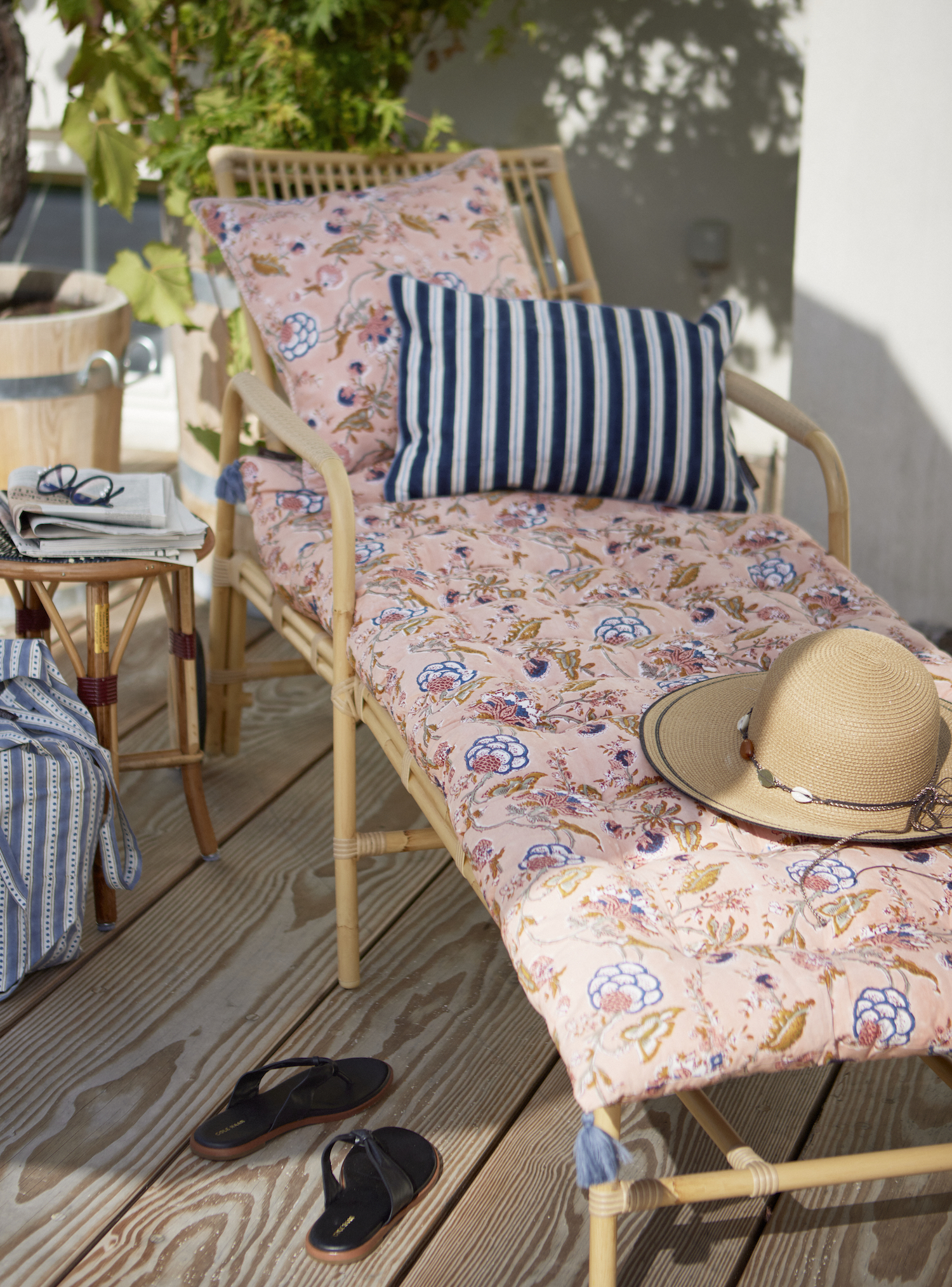 Na bambusowej leżance na tarasie warto położyć miękki toper w piękny kwiatowy wzór, aranżacja marki bungalow.dk