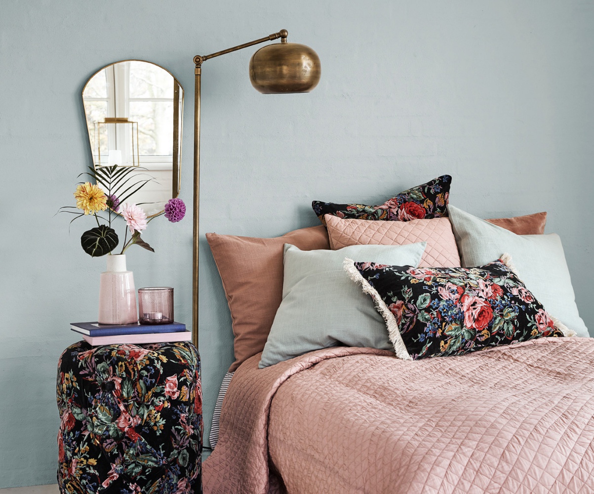• szara sypialnia z różowymi dodatkami