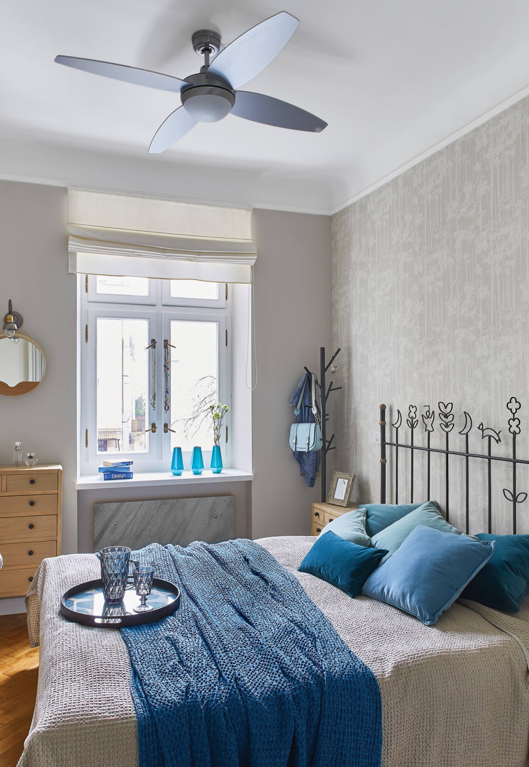 Szare ściany i niebieskie dodatki w sypialni, STYLIZACJA: KASIA MITKIEWICZ, ZDJĘCIA: MICHAŁ MUTOR
