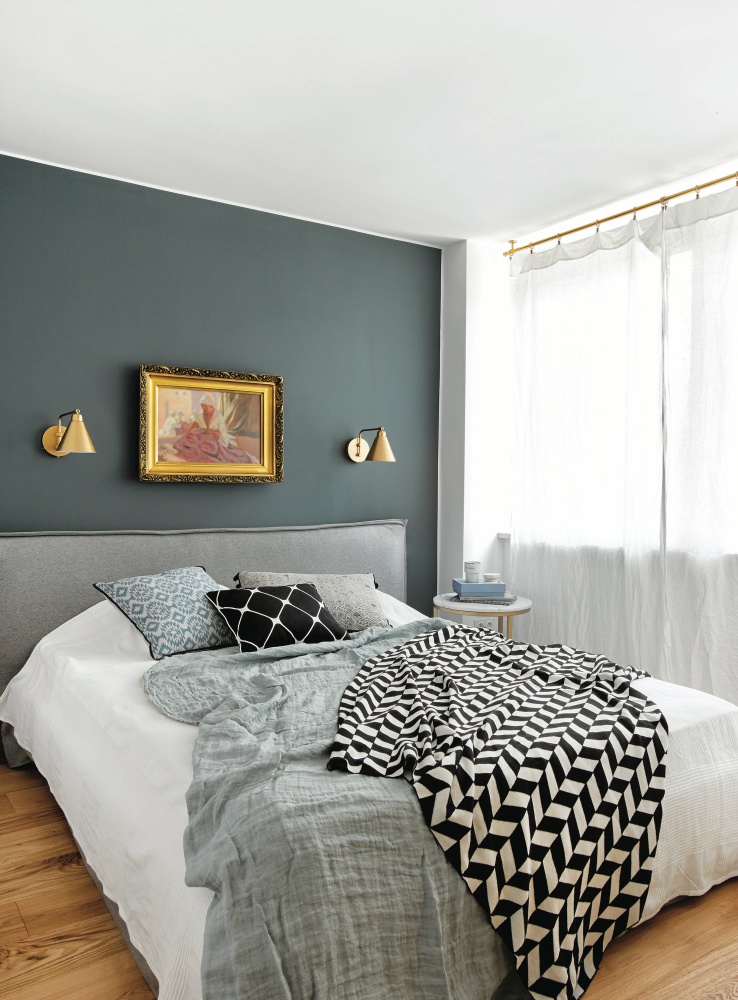 • Szare ściany i niebieskie dodatki w sypialni