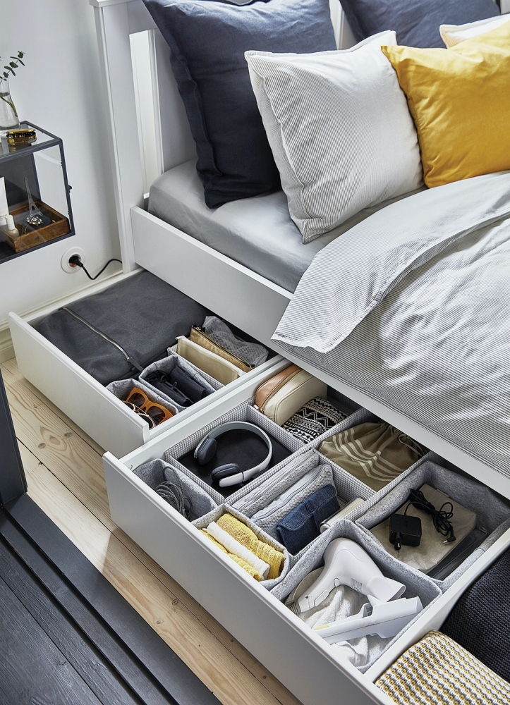 Pojemniki Songesand na zapasowe kołdry i poduszki, dzięki kółkom łatwo je wsunąć pod łóżko, ikea.pl