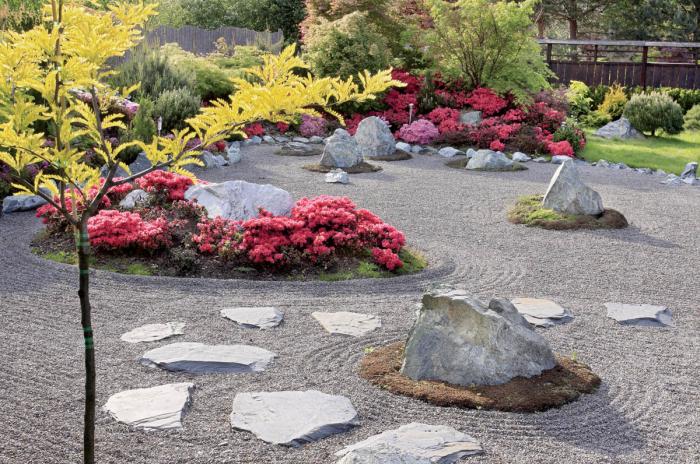 Karesansui- "ogród żwiru i kamieni". Żwir jest grabiony w charakterystyczne koncentryczne kręgi, które symbolizują fale opływające wyspy japońskie.