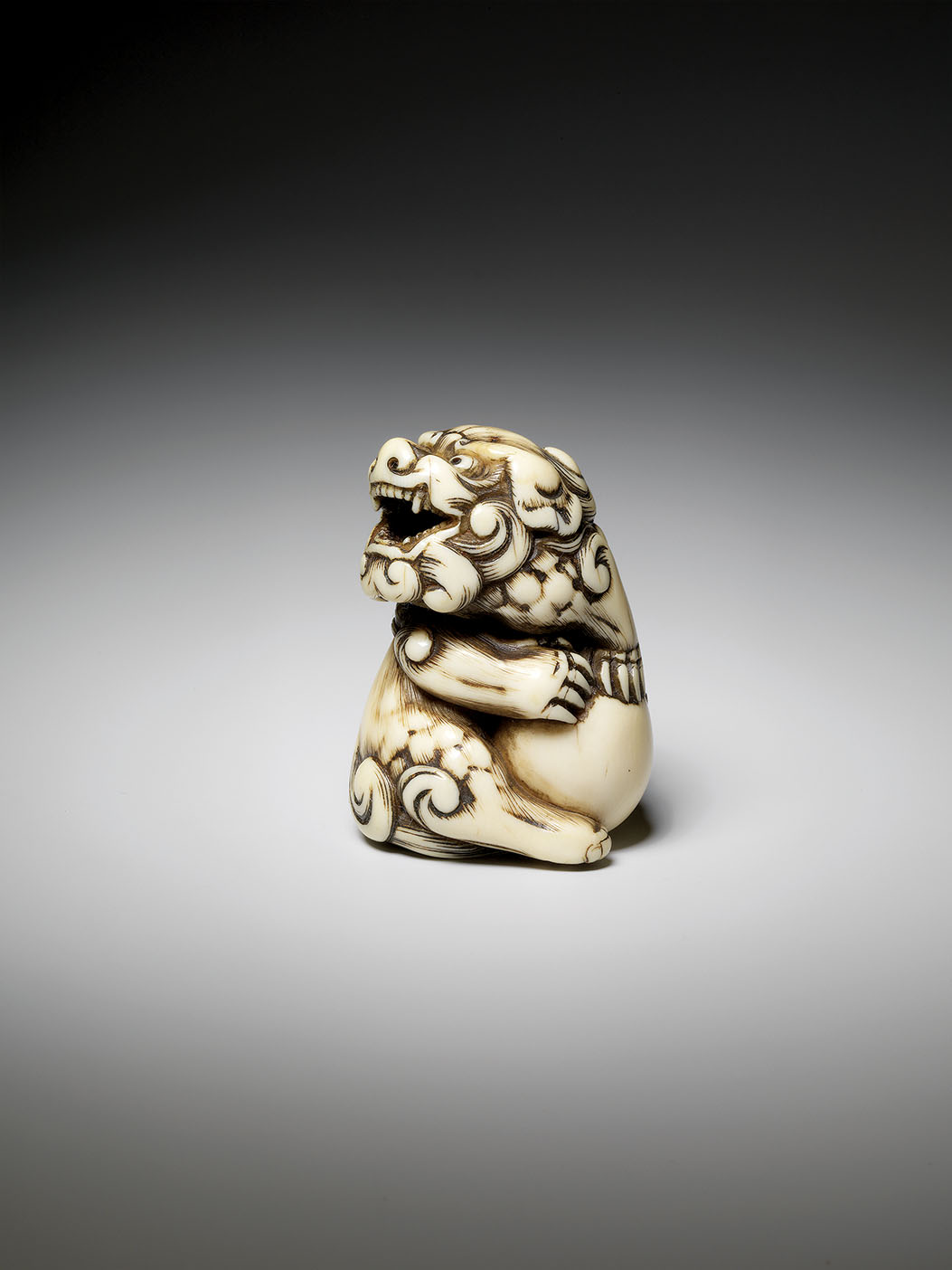 Mitsuharu „Shishi trzymający łapy na piłce”, kość słoniowa, ok. 1770 r.