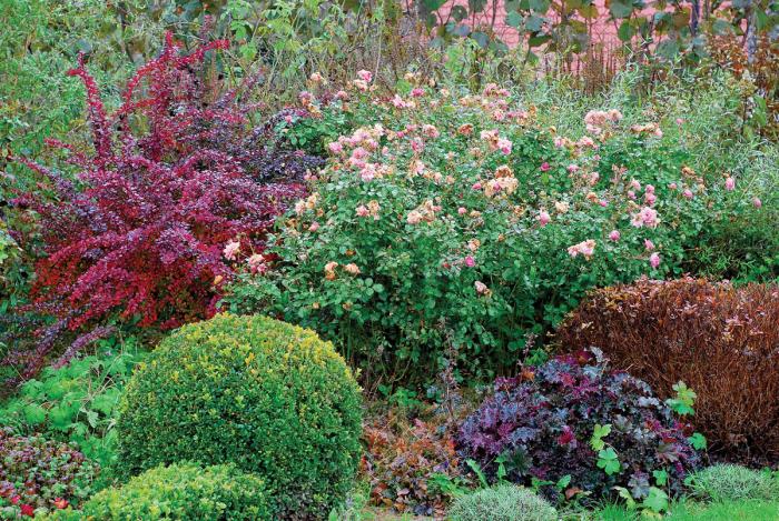 Na różowo- czerwonej rabacie otoczonej bukszpanem rządzi róża 'Bonica'. U jej stóp rośnie żurawka 'Purple Petticoast', niżej płożą się bodziszki.