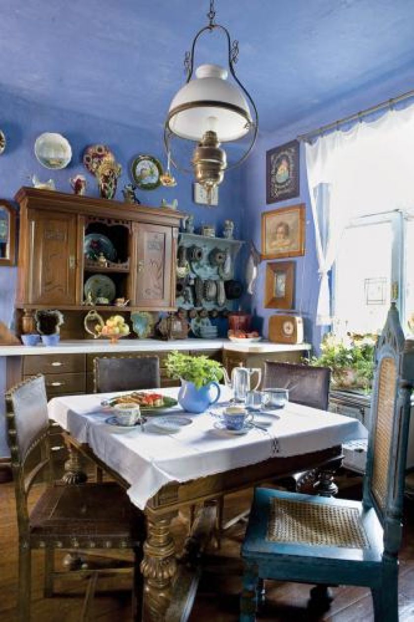 W kuchni znajduje się wiele dekoracyjnych naczyń i figurek.