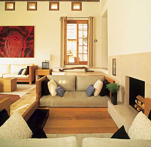 • Na tarasie kanapa i niskie stolik. Kamień i drewno w jednym domu