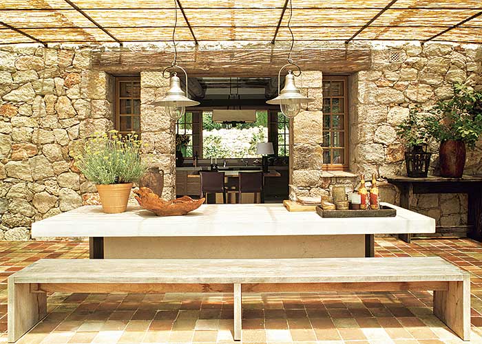 Wprost z kuchni wychodzi się na taras osłonięty bambusowym dachem. Blat stołu został zrobiony z jednego bloku kamiennego, ławy z drewna iroko.