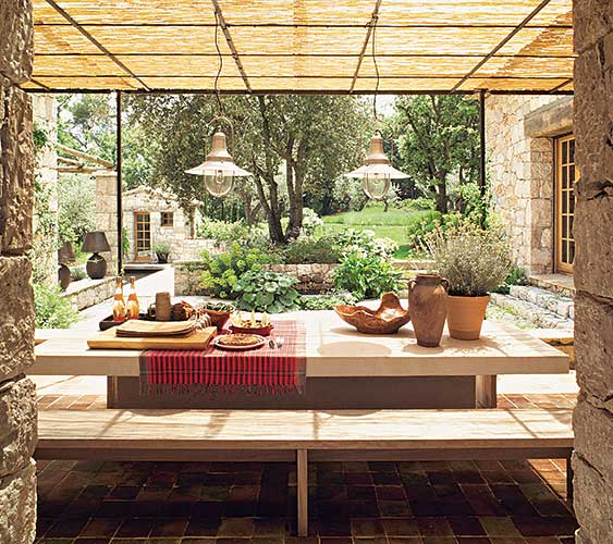 Wprost z kuchni wychodzi się na taras osłonięty bambusowym dachem. Blat stołu został zrobiony z jednego bloku kamiennego, ławy z drewna iroko.