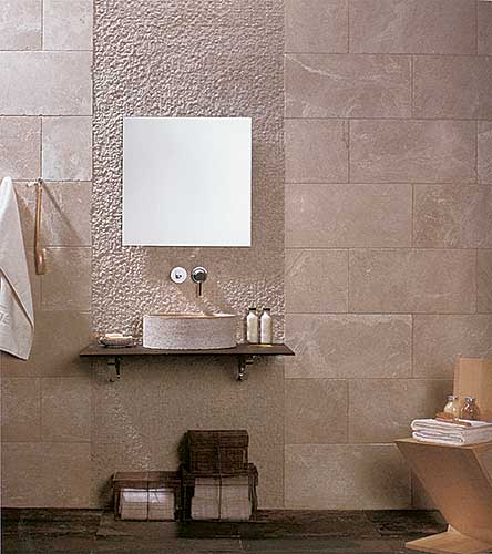 Różne faktury kamienia, a jednak pełna harmonia. Umywalka Navona Abujardama Crema (cena około 6000 zł), ściana pod lustrem z marmurowej mozaiki Even Crema Greccia (cena około 3000 zł/mkw.), obok duże płyty z marmuru Crema Greccia (676 zł/mkw.). Na podłodze kamień kwarcowy Nepal - kosztuje około 700 zł/mkw. ANICAR.