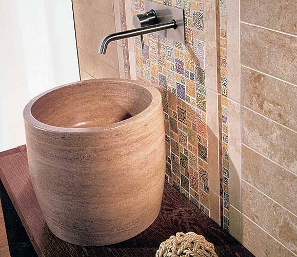 • Umywalka zrobiona z jednego bloku trawertynu. Wysokość - 48 cm. Kolekcja Travertino Noce. Cena - 9500 zł. YETI