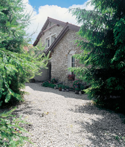• Wokół domu zostały wysypane drobne kamienie. Świetnie komponują się z elewacją domu.