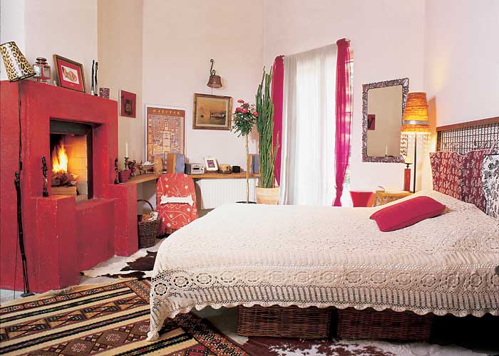 W sypialni stylistyczny miszmasz, ale wszstko spina energetyczna czerwień.
