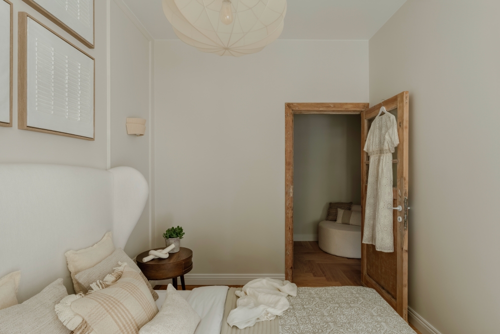 Powrót do artykułu Kaszmirowe mieszkanie z bielą, akcentami beżu i tapetami w oprawie ze sztukaterii. To wnętrze koi zmysły!