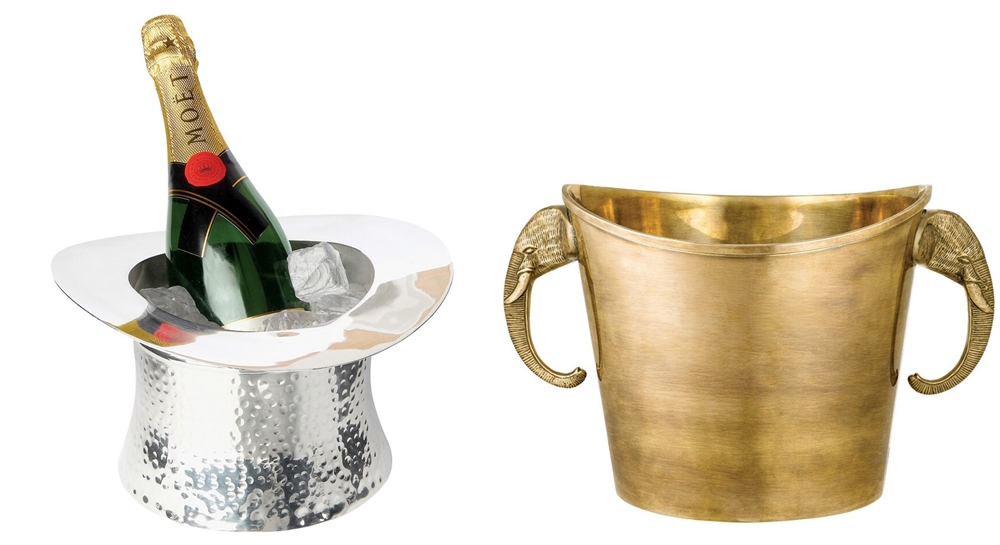 Od lewej: Hat Wine Cooler – srebrzony kubełek w kształcie kapelusza, w stylu glamour, annabeljames.co.uk; Maharaja – ze stali, wykończenie: postarzany mosiądz, clue-studio.pl