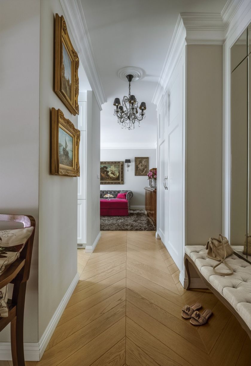 Szerokie klepki parkietu ułożone we francuską jodełkę dają złudzenie dłuższej perspektywy, dzięki czemu mieszkanie wydaje się większe, niż jest w rzeczywistości.
