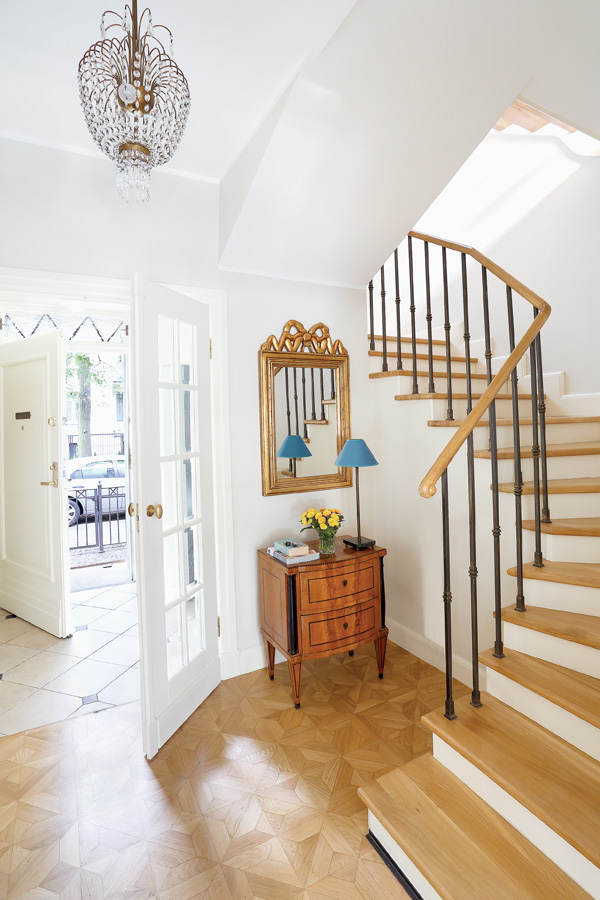 Ciemne schody wystarczyło przemalować aby nabrały lekkości. Komódka jest z początku XVIII wieku, do tego przedwojenne lustro i kryształowy żyrandol.