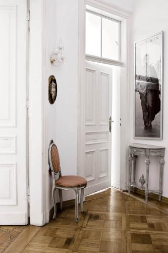 Czarno- białe portrety filmowych gwiazd zestawione z francuskimi, bogatymi meblami nadają wnętrzon lekkości.