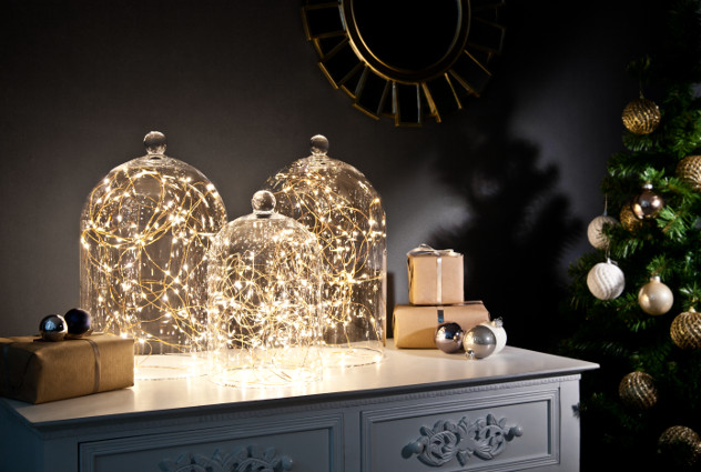 Najprostsze pomysły zazwyczaj są najlepsze. Taka dekoracja świąteczna jest wręcz genialna w swej prostocie. Wystarczy wysoki szklany klosz - np.taki, jakim przykrywamy ciasto, i dowolone przedmioty kojarzące się ze świętami. Mogą to być bombki, sznur światełek ledowych, szyszki, które możemy oprószyć białym sprejem, orzechy - pomalowane na złoto, żołędzie, gwiazdki albo małe świąteczne pluszaczki.