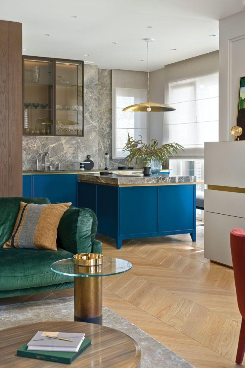 Kolorowe mieszkanie w bloku, a w nim niebieska kuchnia, zielona kanapa i krzesła w kolorze wina