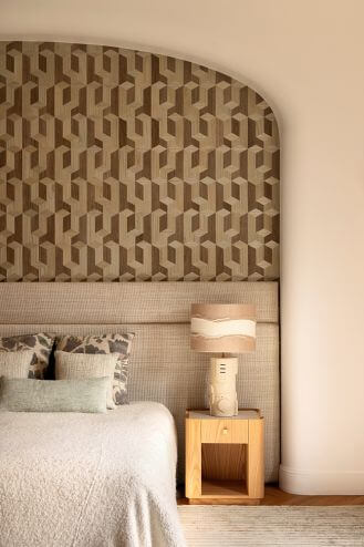 • sypialnia w beżach i szarościach z dużym łóżkiem z tapicerowanym wezgłowiem