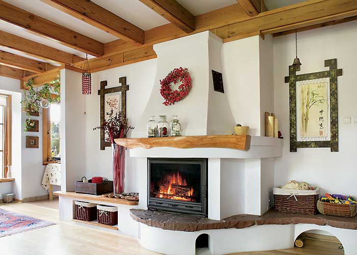 • Kominek w stylu rustykalnym. Kolonialny salon w dworku