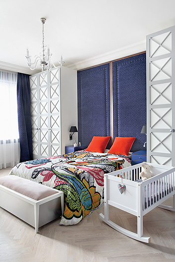 • Ciekawe komody i ozdobne szafy to pomysł Michała. Do granatowej sypialni pasuje żółte krzesło z Vitry.
