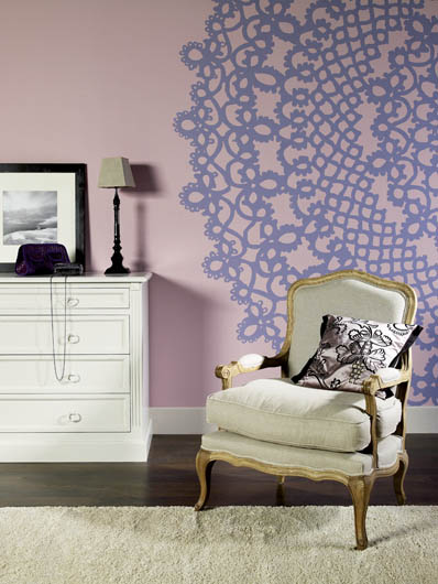 Z koronkowym ornamentem. Farba, Satynowy Wrzos, to Akrylit W Fashion Collection (54 zł/2,5 l). DEKORAL