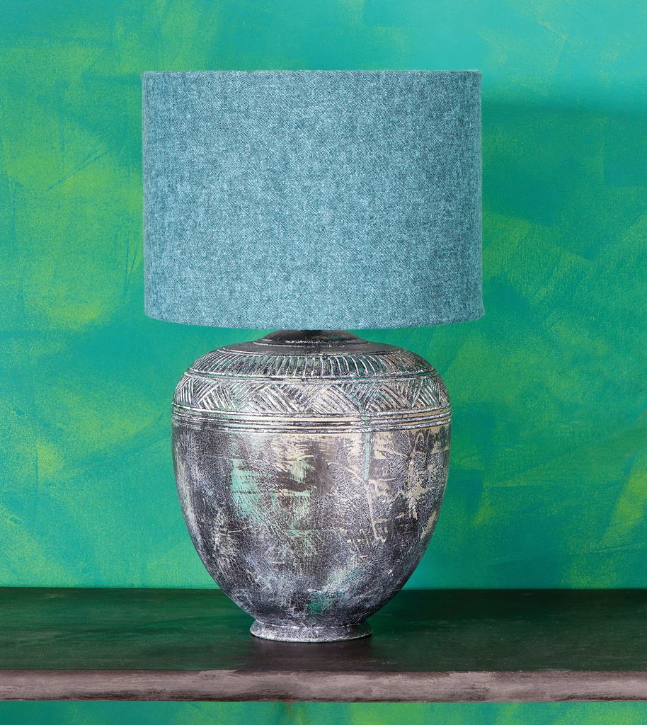 LAMPA, podstawa pomalowana farbami w odcieniach Florence, Château Grey i Duck Egg Blue, po wyschnięciu nałożono farbę w odcieniu Graphite, a gdy wyschła, przetarto naczynie papierem ściernym, by odsłonić bazowe kolory i naniesiono dwufazowy preparat do spękań, zabezpieczono jasnym woskiem, ANNIE SLOAN