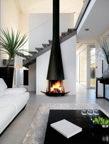 • Kominek bez komina? Tak, firma Arkiane wpadła na pomysł odprowadzania spalin dołem - cztery rury schowane są w podłodze.