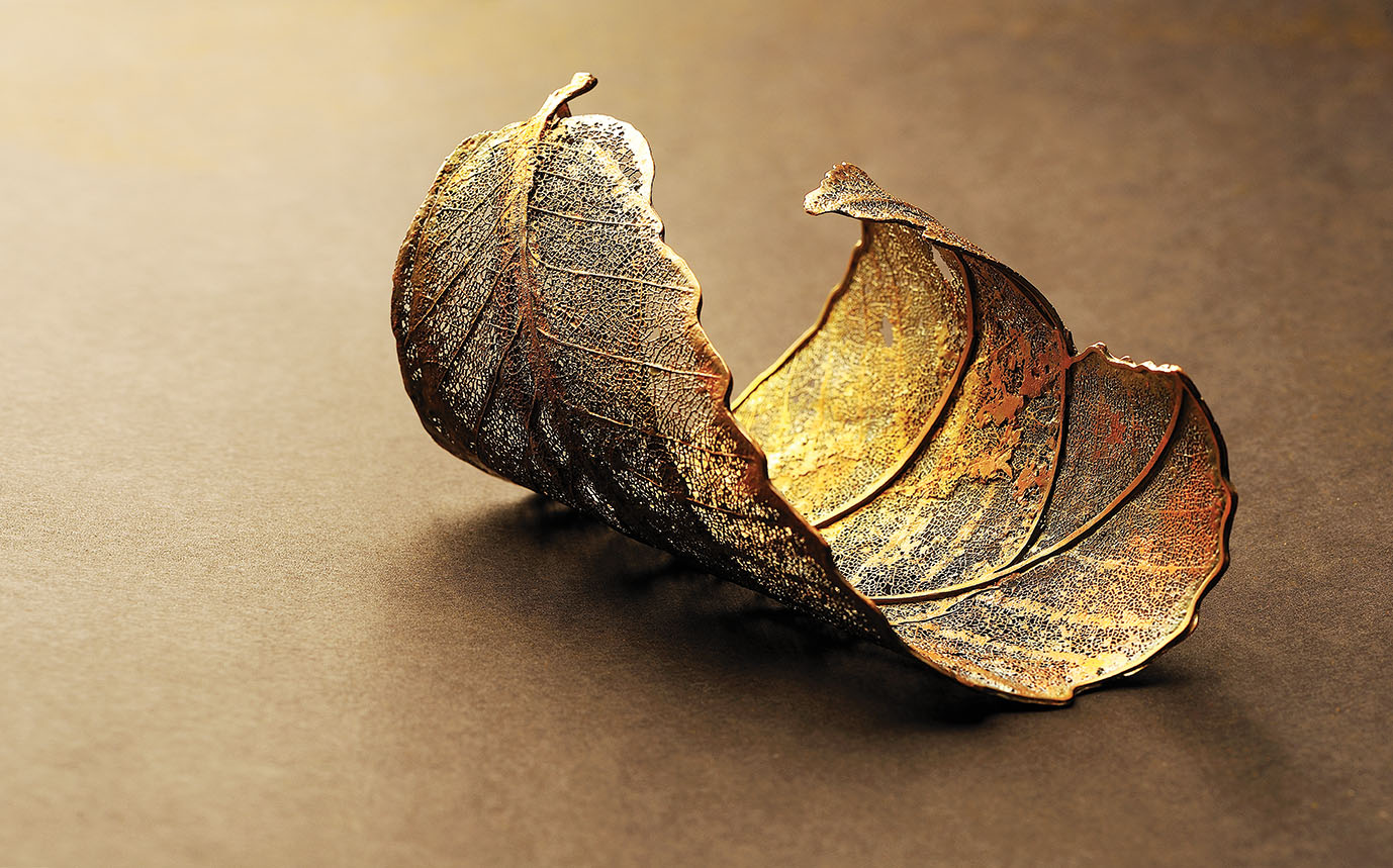 Ewa Rudowska wyczyszczone fragmenty liści pokrywa miedzią, galwanizuje srebrem albo złotem, a potem układa w kolie, bransoletki, broszki, pierścionki...