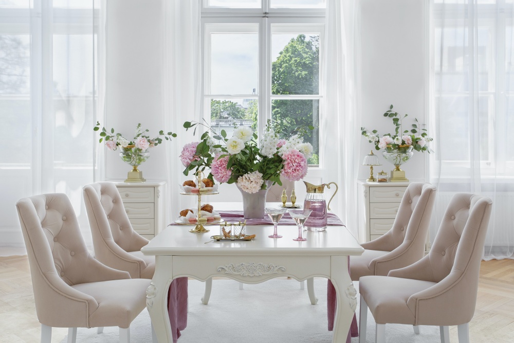 Krzesła Opera, drewniane nogi lakierowane na biało, stół Giselle, bemondi.pl